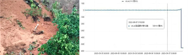 2023年9月,广东省梅州兴宁连续降雨,滑坡体于9月7日发生垮塌,设备成功预警。