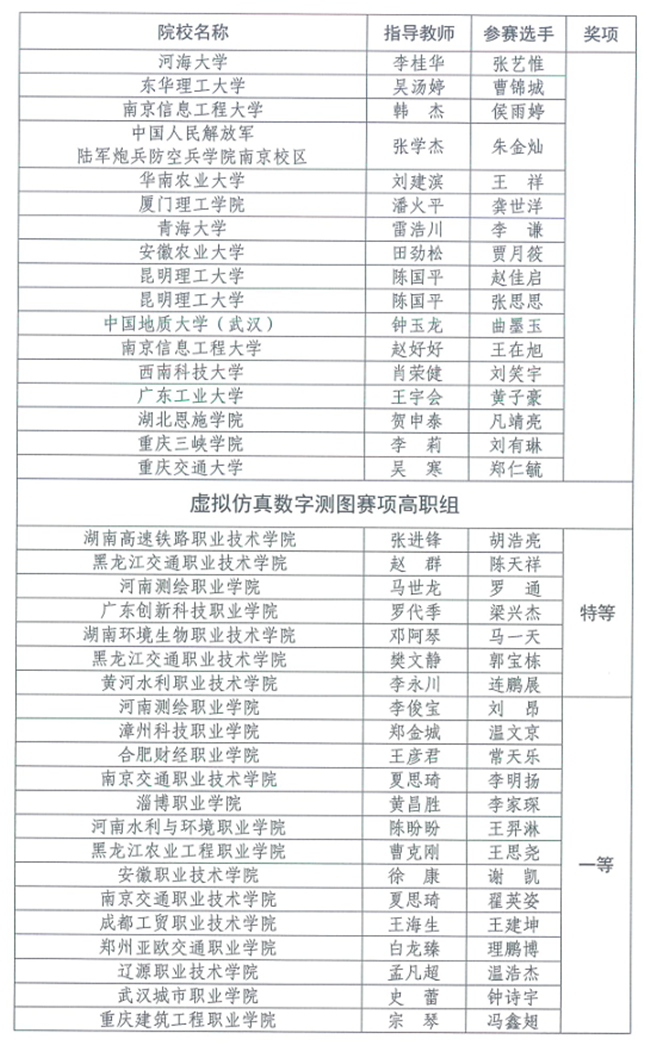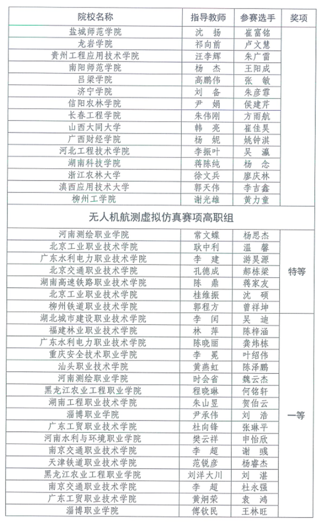 竞赛设本科、高职专科、中职3个类别,每个类别设虚拟仿真数字测图、无人机航测虚拟仿真、机载激光雷达虚拟仿真3个赛项,奖项分为优秀团体奖、赛项奖和优秀指导教师奖。(完整获奖名单附后)
