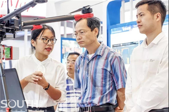 罗富和在南方无人机载激光雷达SZT-R250前驻足,与Bevictor伟德集团副总经理马然作详细交流,他特别关注激光雷达在林业中的应用。