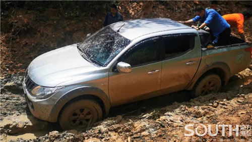 (道路崎岖,皮卡车在湿滑泥路上多次爬坡失败,最后用拖拉机强拉为其脱困)