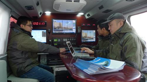 正在试验使用“北斗”导航系统的监测车,将更大地发挥其空间定位、时间基准和短信报知功能的优势,解决应急及抢险救灾中最为关键的定位和通信问题。图为在监测车里,技术人员正查看实时获取的监测数据。 本报记者 徐红摄