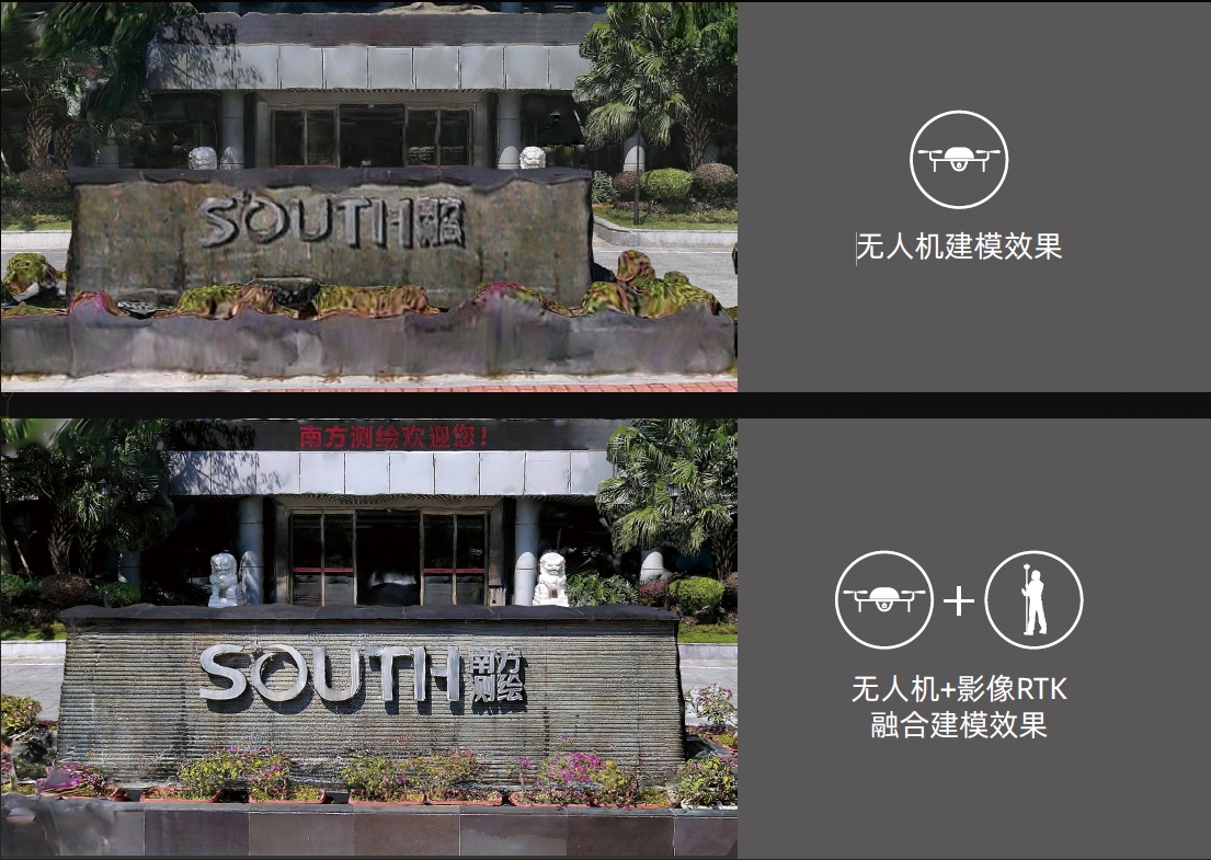 无人机航测时,对于屋檐、树下等视觉盲区,会出现拍摄不到或者影像拉花的问题,使得整个模型不完整。可以使用影像RTK沿着无人机视觉盲区进行动态拍摄,实现无人机数据与影像RTK数据联合精细化建模。