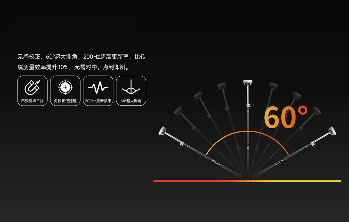 惯导倾斜测量 | 内置IMU惯性测量传感器,支持惯导倾斜测量功能,根据对中杆倾斜方向和角度自动校正坐标 |