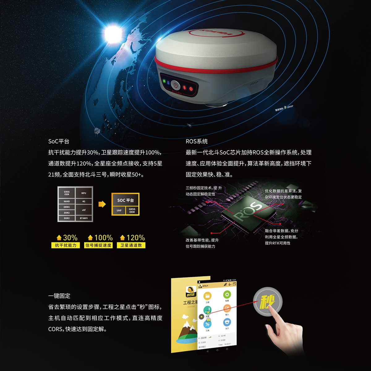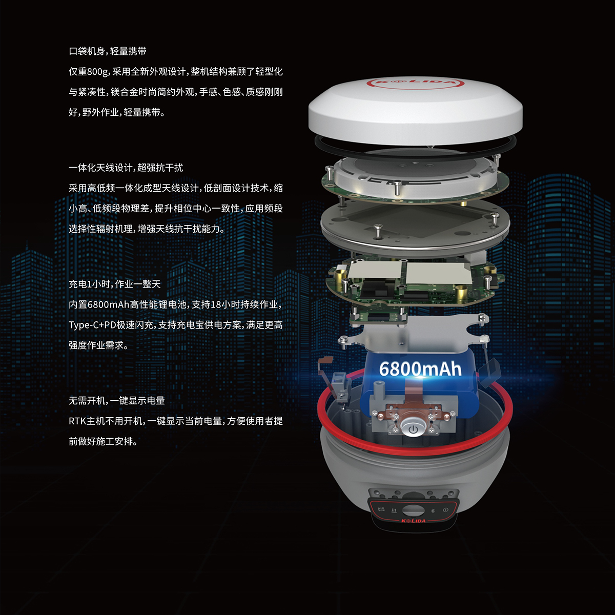 电池 | 内置6800mAh高性能锂电池 7.4V;移动站手簿网络模式作业满足18小时续航时间 |