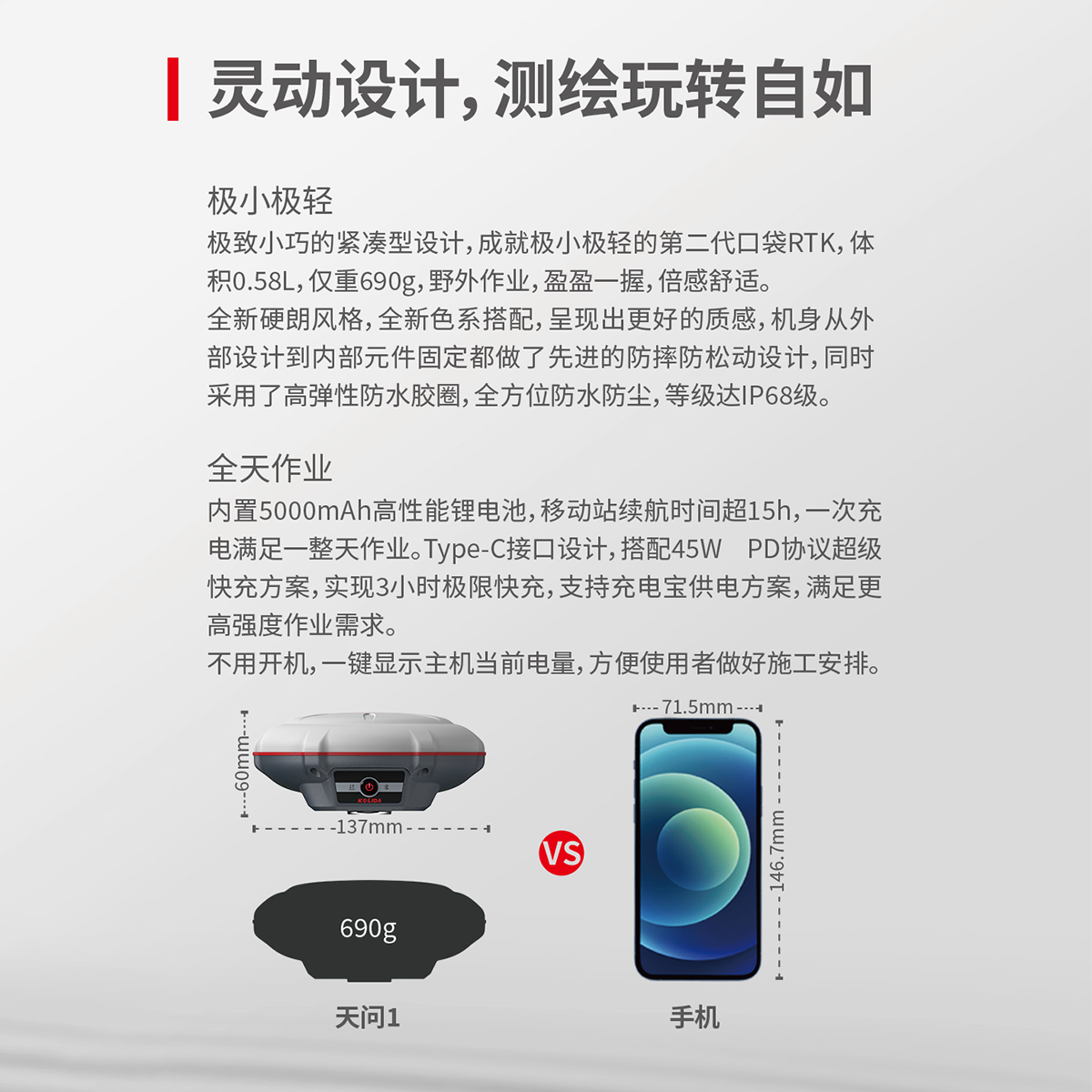 RTK测量精度 | 平面:±(8mm+1×10-6D)(D为所测量的基线长度,单位为mm) |