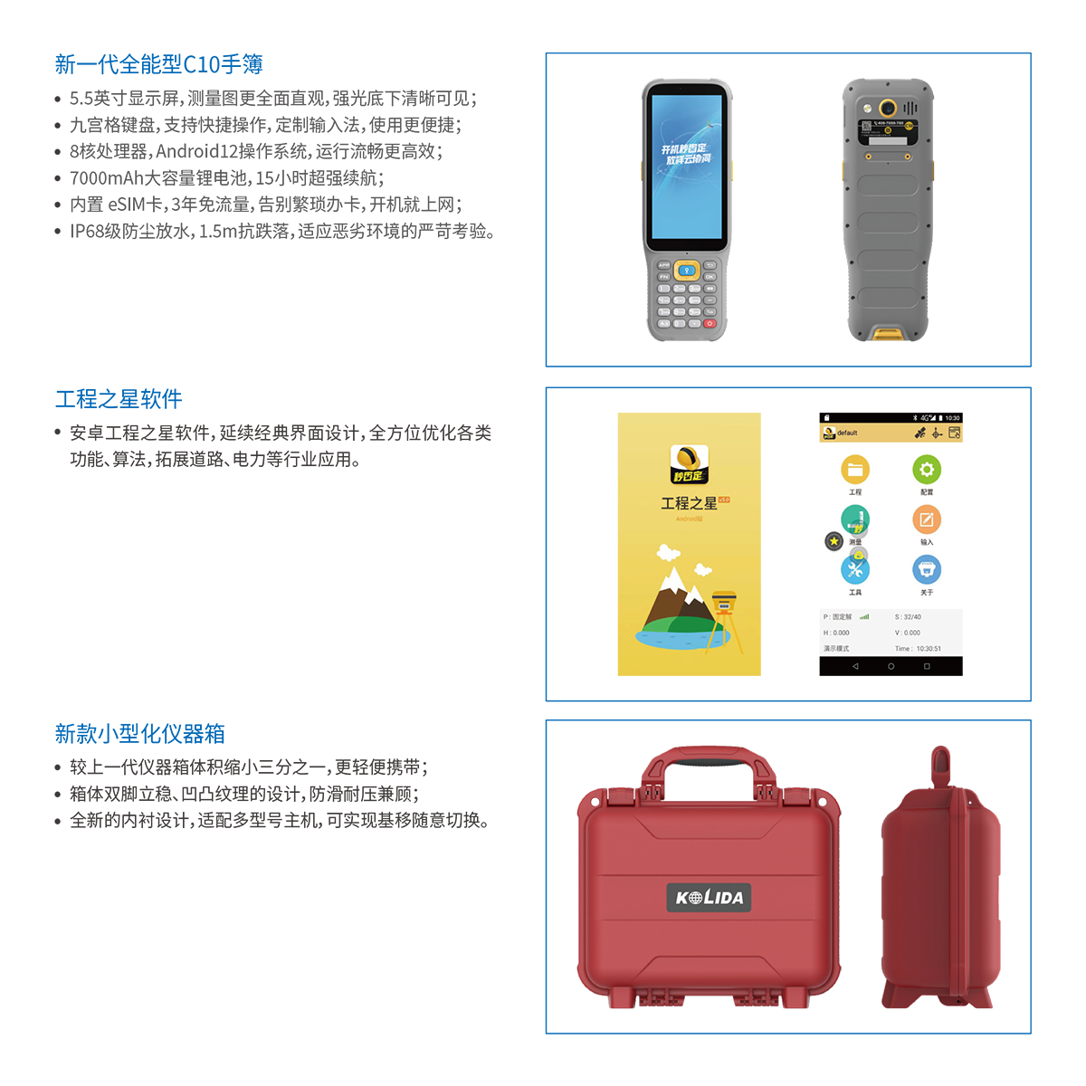 惯导倾斜测量 | 内置IMU惯性测量传感器,支持惯导倾斜测量功能,根据对中杆倾斜方向和角度自动校正坐标。 |