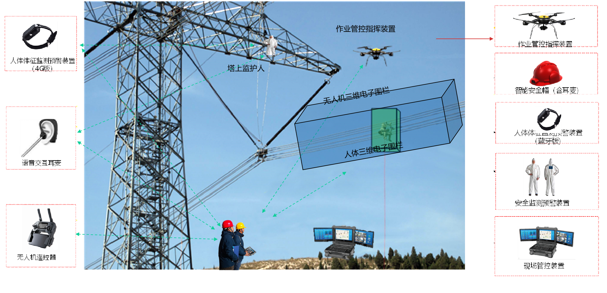 针对带电作业现场安全技防手段不足、智能化管控装置缺失等问题,运用北斗高精度定位技术、不规则三维电子围栏等技术,研发智能辅助带电作业检修管控指挥平台,同时基于三维系统平台分别开展研制作业管控指挥装置、现场管控装置、安全监测预警装置以及人体体征监测预警装置等智能装置的研究,实现对带电作业人员的高精度行为管控指挥、实时安全预警,为带电作业人员提供全方位360度的安全预警保护。