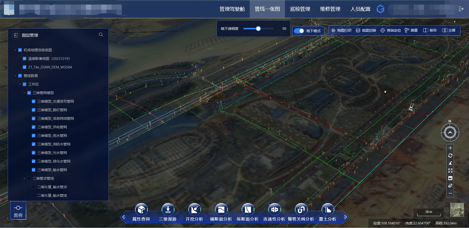 包含查询、统计、分析、管线巡检等模块,实现多功能、多业务应用。为管线改造改迁提供决策支撑,为建设提供分析,防止施工过程中挖断管线影响日常工作。