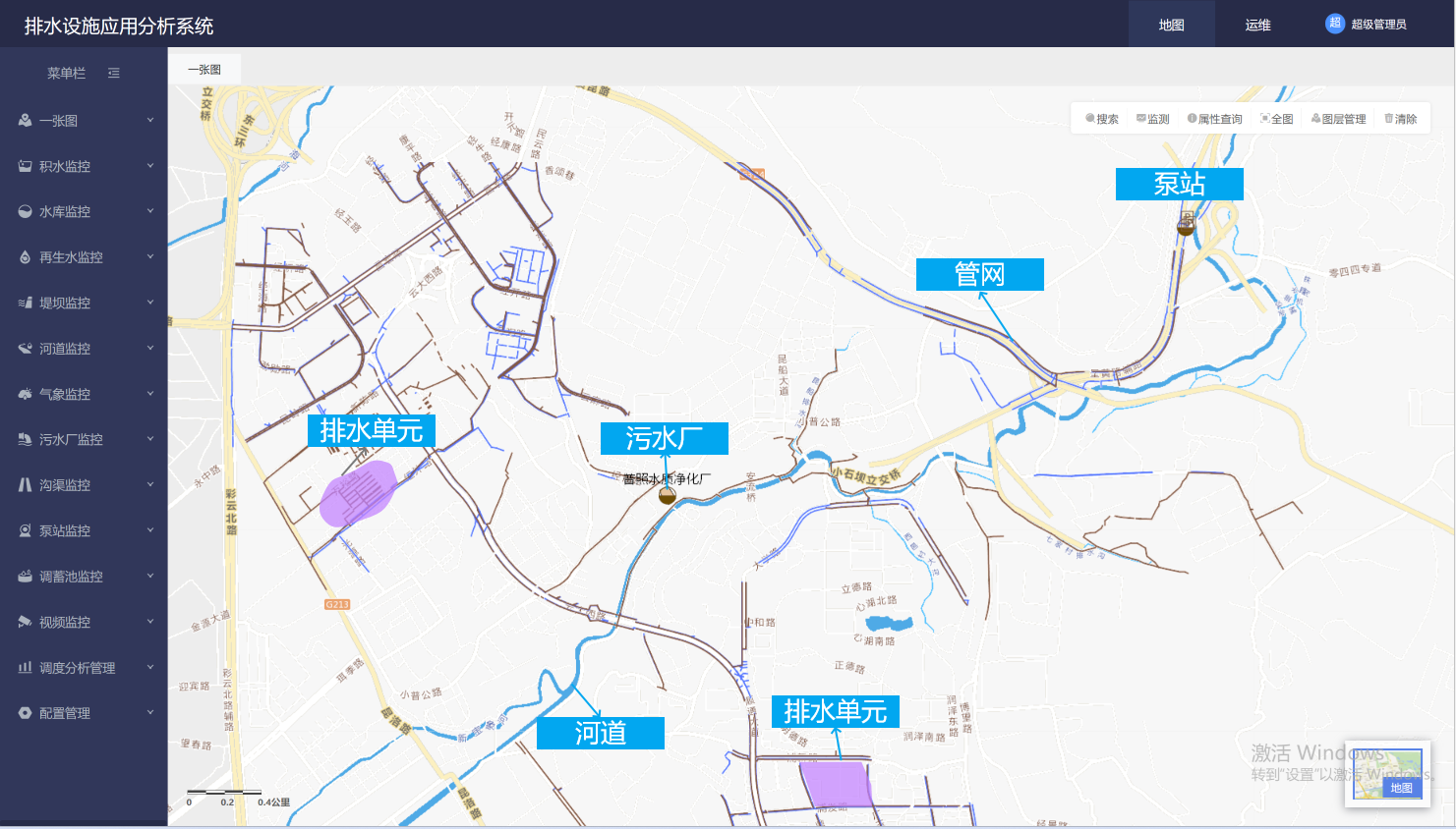 从“排水户(排水单元)--管网--泵站--污水厂--河涌”打通水务管理上下游融合关联数据形成“水环境管理一张图”,协助管理者捋清流域内管理对象之间的关联关系。