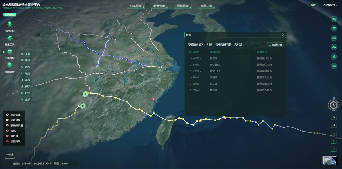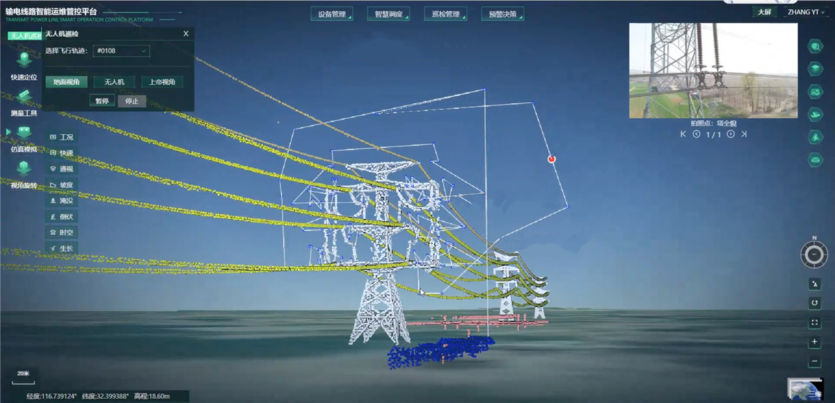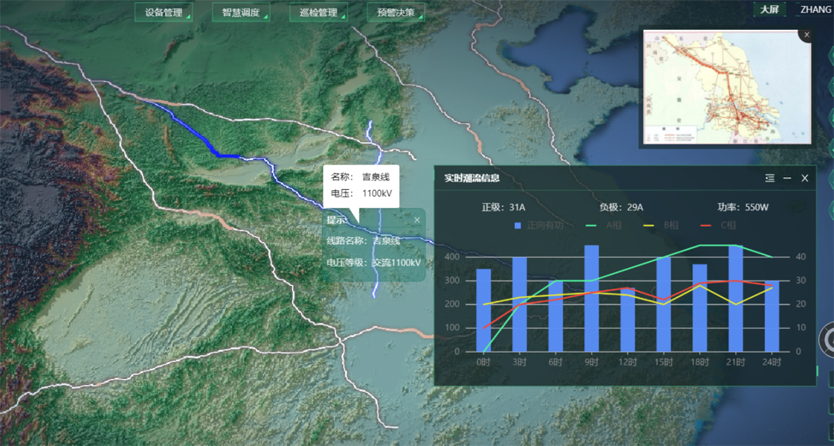 实时接入电流、电压、有功、无功等运行数据,在三维场景下叠加负荷变化、潮流、停电等调度数据,提前研判线路故障,实现事前防范和事中控制。